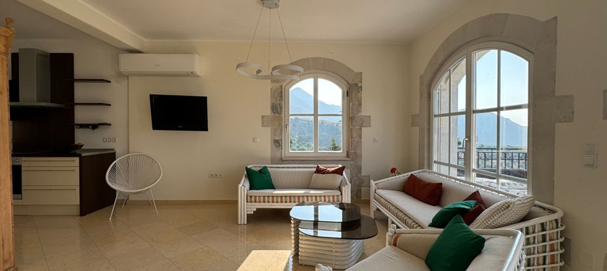 The first floor (43 sqm) features two bedrooms and one bathroom. One of the bedrooms includes arched glazed doors that lead to a spacious veranda with magnificent sea and mountain views. This feature not only enhances the room’s brightness but also offers a peaceful outdoor space with stunning scenery—an ideal spot to relax and enjoy the surroundings.