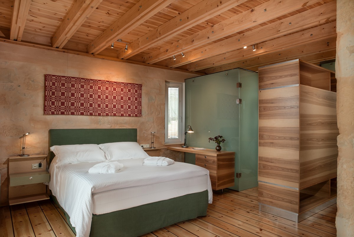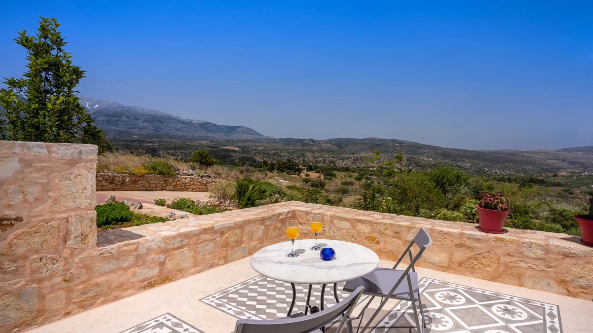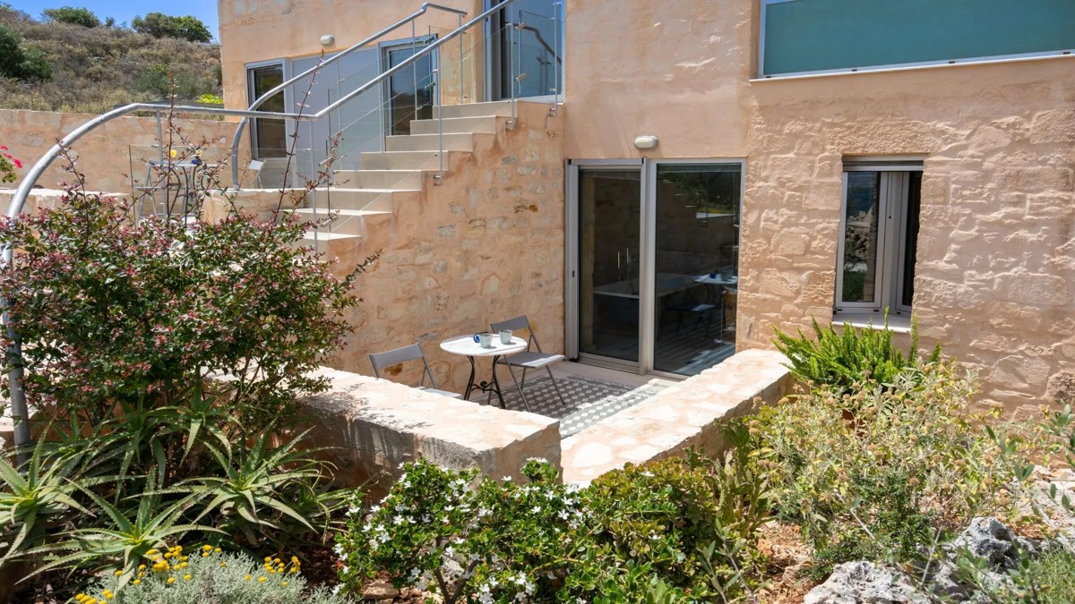 Blending the amazing view with luxury and exquisite architectural design, located in an ideal position providing a majestic simultaneous view of the Bay of Souda in the North and the White Mountains in the South. The quiet area ensures total privacy and the utmost relaxation, while at the same time you are surrounded by the authentic Cretan scenery and vegetation. The combined use of stone, wood, metal and glass blends perfectly with the environment, all in a modern structure that includes the traditional architecture of the region of Apokoronas.